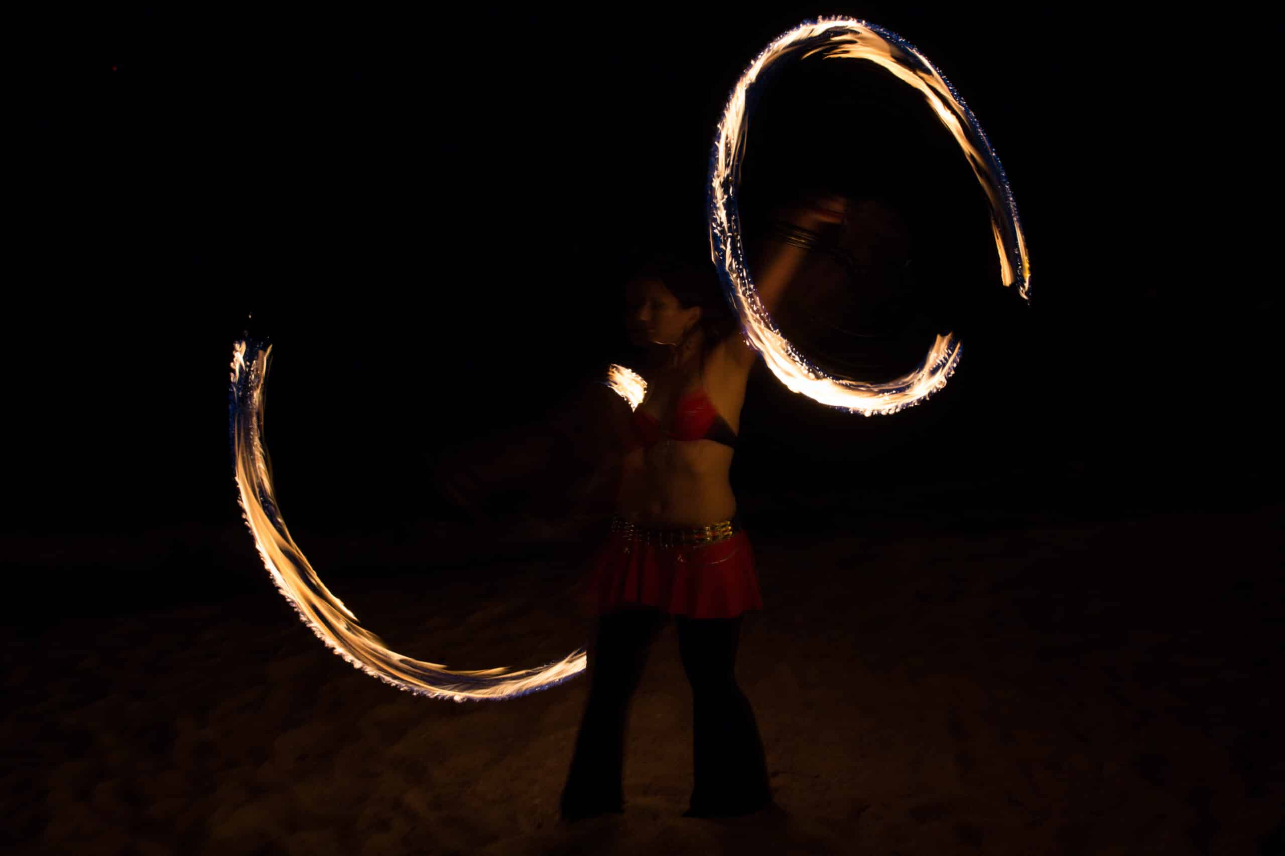 Existen también otros malabares con los que podemos experimentar: los abanicos de fuego son un buen ejemplo de ello. Su uso es similar al de las cariocas, aunque conserva su propio estilo y técnica. Permite crear efectos visuales muy potentes y estéticos, combinando muy bien con el Tribal Fusión e incluso con el Rock. De manera puntual, en intensivos o monográficos, también podremos utilizar otros elementos como el staff (bastón malabar) o los abanicos de seda.